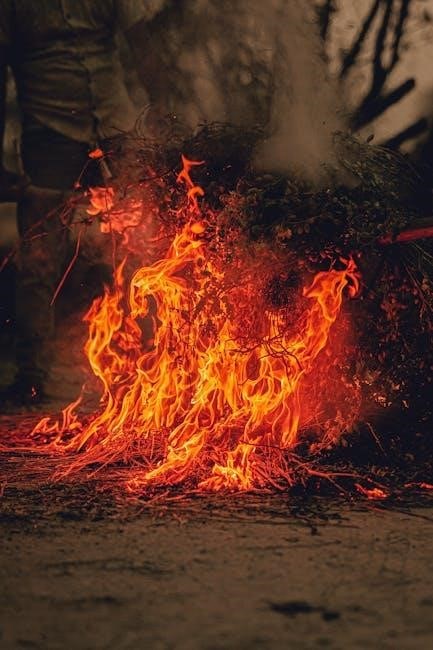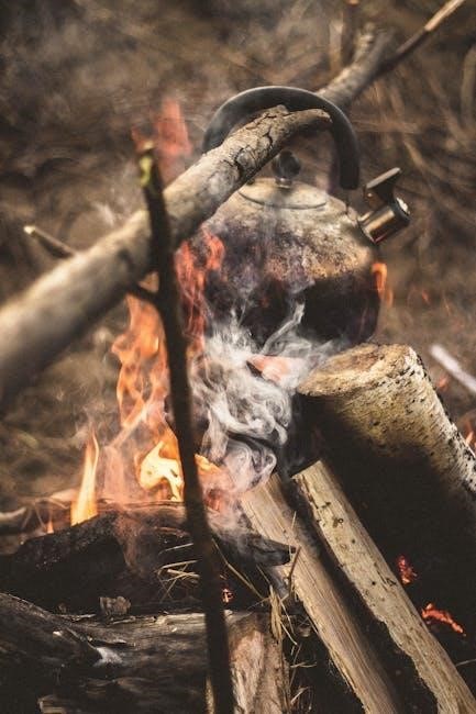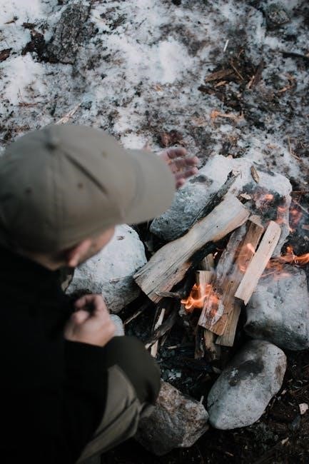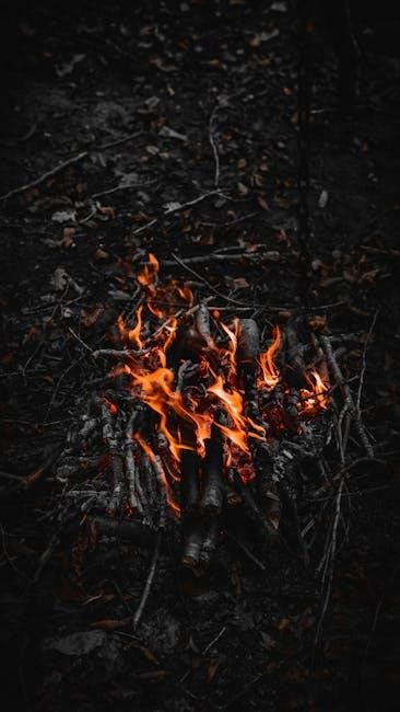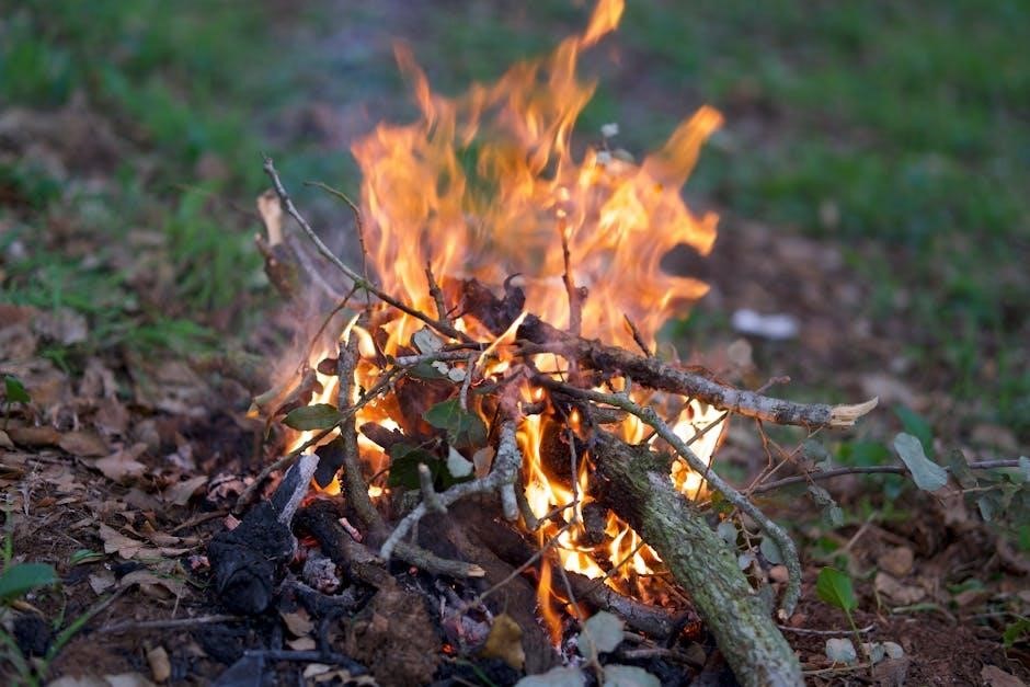 Fuel sources progress from small twigs (“kindling”) to larger branches. The PDF details identifying dry, dead wood, crucial in damp environments. Understanding wood types and their burning characteristics is also vital.